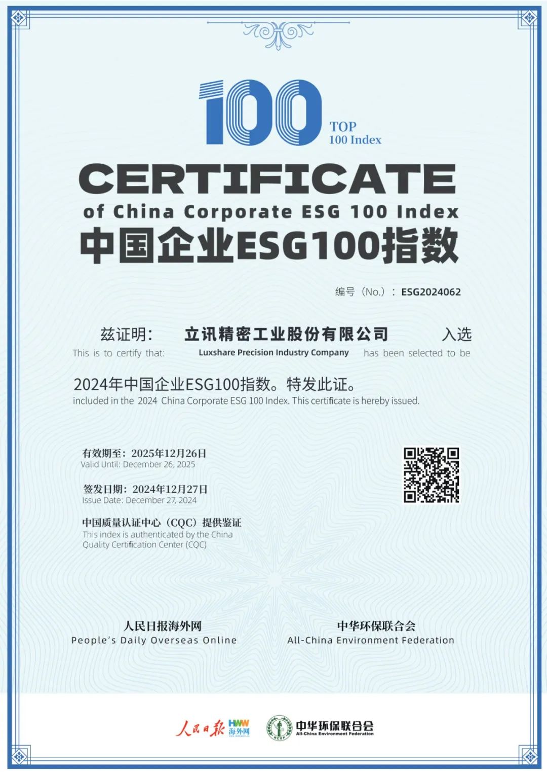 近日,由人民日报海外网与中华环保联合会联合举办的“第二届新时代中国品牌形象海外传播论坛暨2024中国企业ESG蓝皮书发布会”在京召开。为讲好中国品牌与中国企业ESG故事,推动中国企业品牌形象海外传播,大会征集多份ESG杰出案例后纳入《企业ESG蓝皮书:中国企业环境、社会与治理报告(2024)》,并专设“2024中国企业ESG100指数”以对优秀案例进行表彰。金年会官方网站入口精密凭借在可持续发展领域的卓越表现,成功入选“2024中国企业ESG100指数”,充分彰显了公司“将ESG落地生根,引可持续发展枝繁叶茂”的决心和实力。